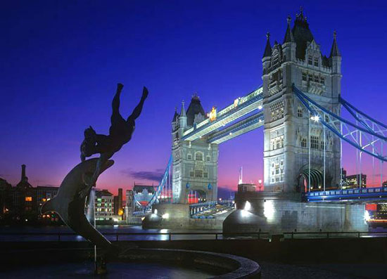 5、海豚与少女 在泰晤士河的北岸,伦敦塔桥旁边,有一个英国后现代艺术家David Wynne1973年竣工的挑战平衡感杰作——海豚与少女的雕像。当夕阳西下,不少旅行者喜欢在这里留下浪漫的合影,也有许多画家沉迷于这和谐又令人心跳的视觉冲击。